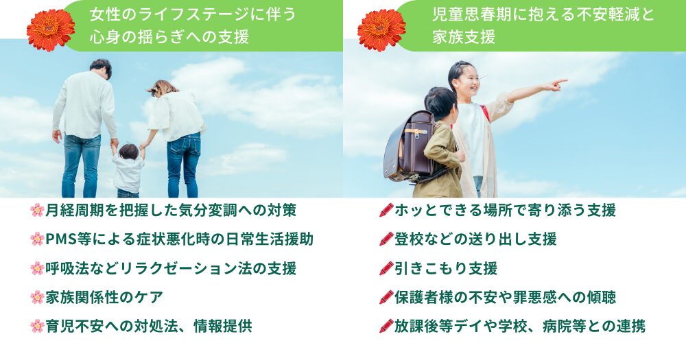 なかでも、女性特有の悩みや、児童思春期に抱える不安など表出が難しいケースに重点的なサポートが可能で、家族を含めた手厚い支援体制となっています。